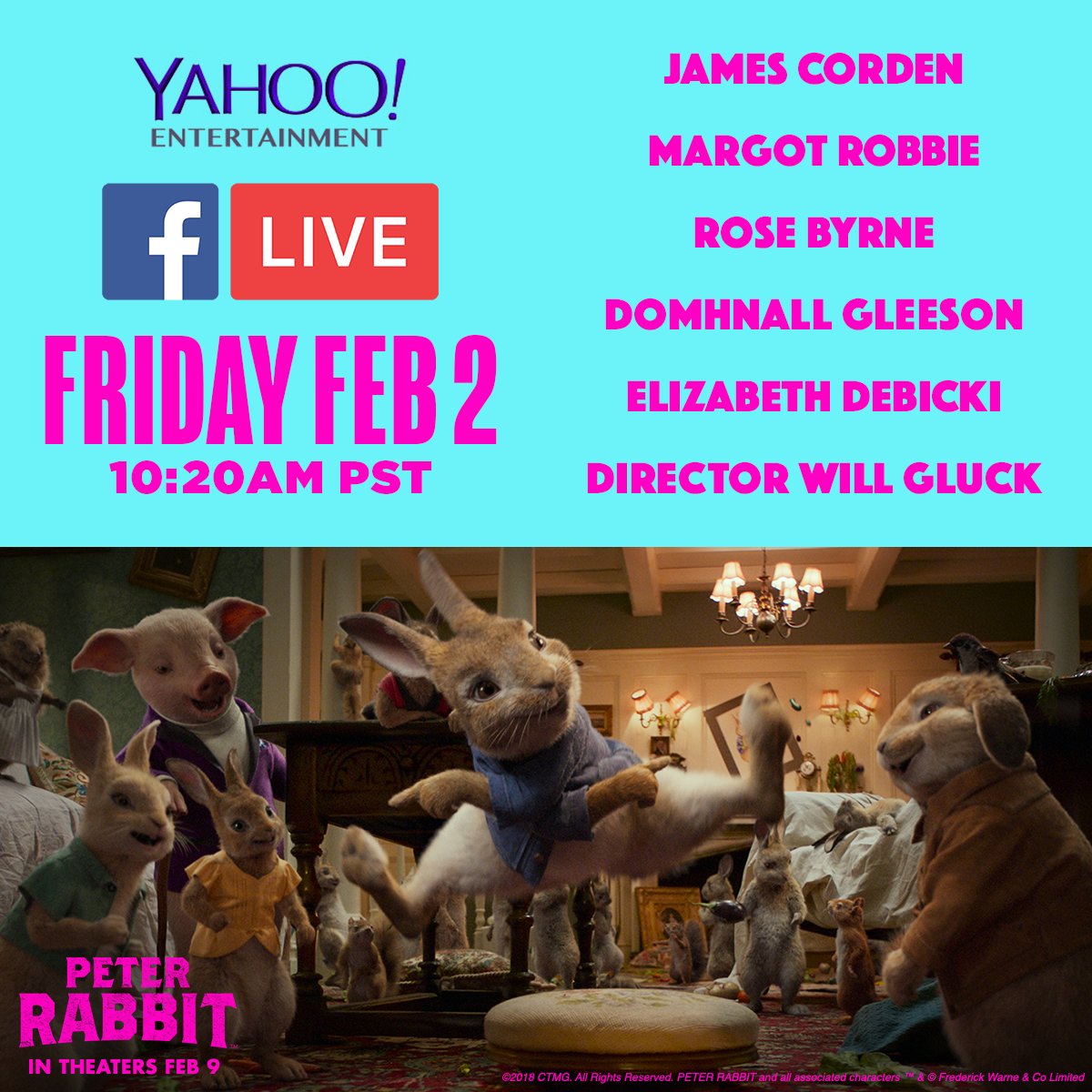 Join us Friday for a Facebook Live Q&A with #PeterRabbit stars @JKCorden, @MargotRobbie, Domhnall Gleeson, Rose Byrne, Elizabeth Debicki & director @willgluckwhat, hosted by @djkevlar. Watch here: http://bit.ly/2DY71Ow pic.twitter.com/NsBaxntPZZ