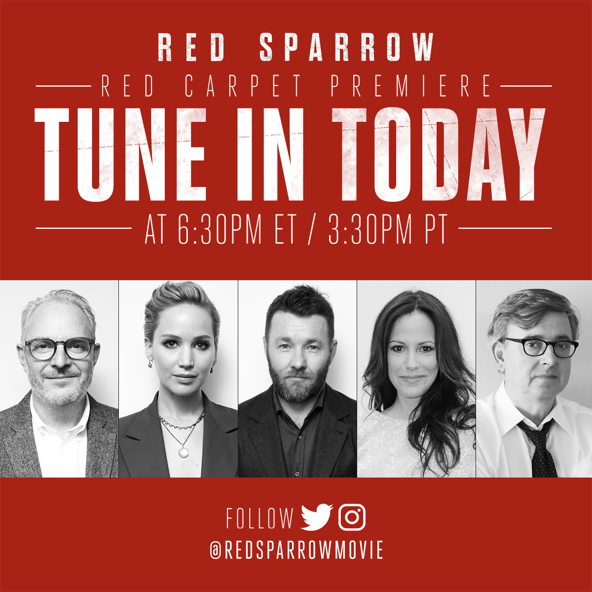 Tune in today at 6:30pm ET / 3:30pm PT for LIVE red carpet coverage from the @RedSparrowMovie premiere. pic.twitter.com/6WJ7PiK6Re