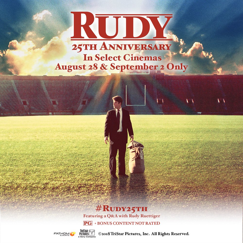 Celebrate the ultimate underdog story when RUDY returns to the big screen for two days only: August 28th and September 2nd! Get tickets now: http://bit.ly/RudyTix pic.twitter.com/eQQv3UpaON