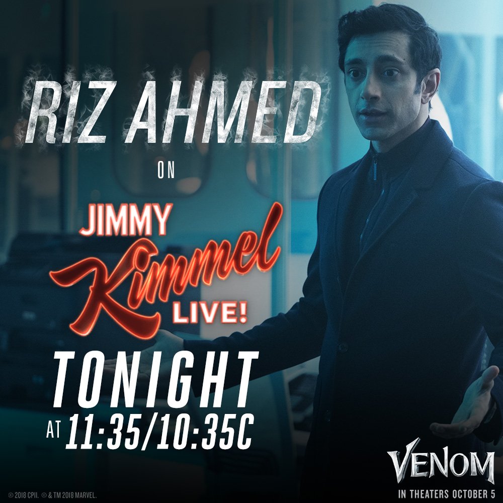 Don’t miss #Venom ’s Riz Ahmed on @JimmyKimmelLive tonight at 11:35/10:35c. pic.twitter.com/6vX6L8bmHL