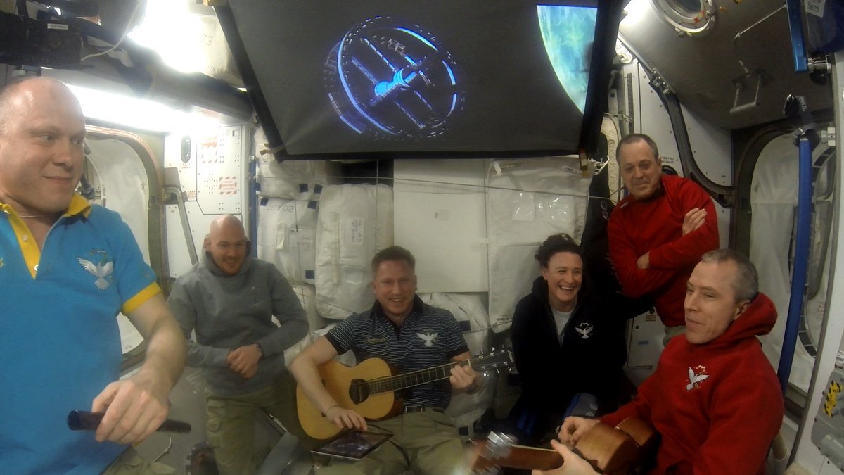 The Expedition 56 crew played music together as a warm up to watching the film #FirstMan