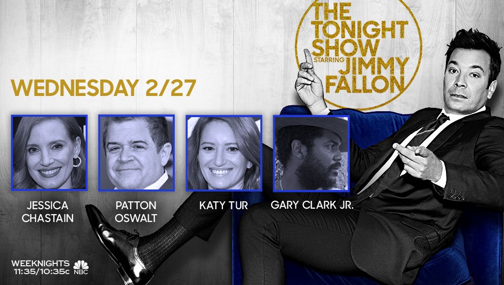 Tonight on the show: @jes_chastain, @pattonoswalt, @KatyTurNBC a performance by @GaryClarkJr! #FallonTonight pic.twitter.com/vJmRG6lNKq