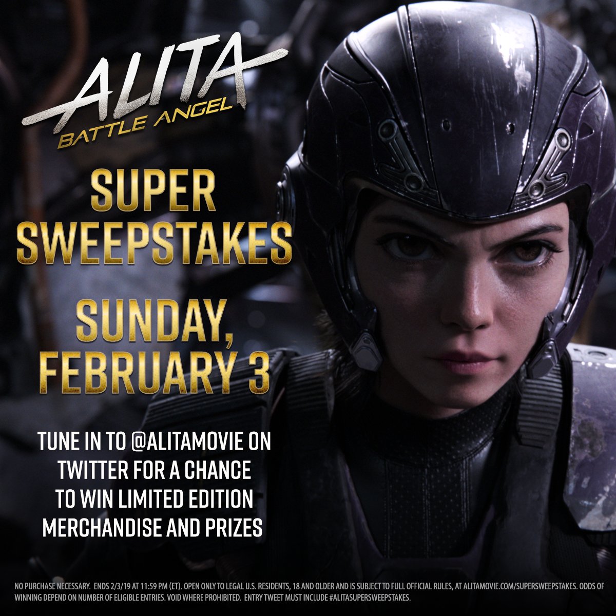 Tune in to @AlitaMovie for trivia, and tweet your answers to #AlitaSuperSweepstakes during the Game this Sunday to win prizes. Check out http://fox.co/AlitaRules for more info. pic.twitter.com/GR9diAWhMz