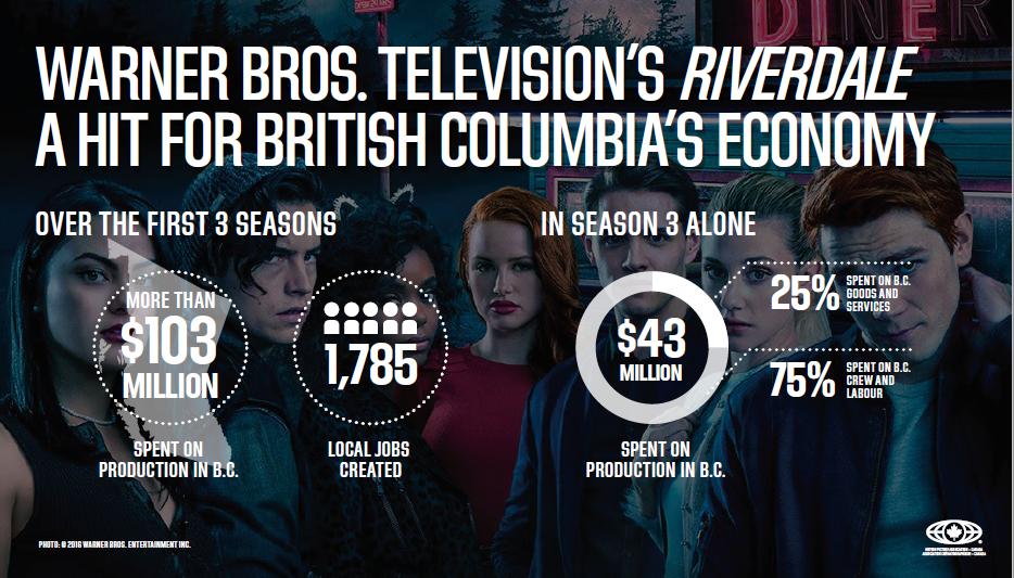 @MPACanada report shows that @CW_Riverdale series has contributed $103 million to BC’s GDP & created more than 1,785 FTE jobs. Over 2,500 IATSE 891 crew members helped create this acclaimed Warner Bros. series. Thank you @WarnerBrosEnt @Riverdale #891shows #Riverdale