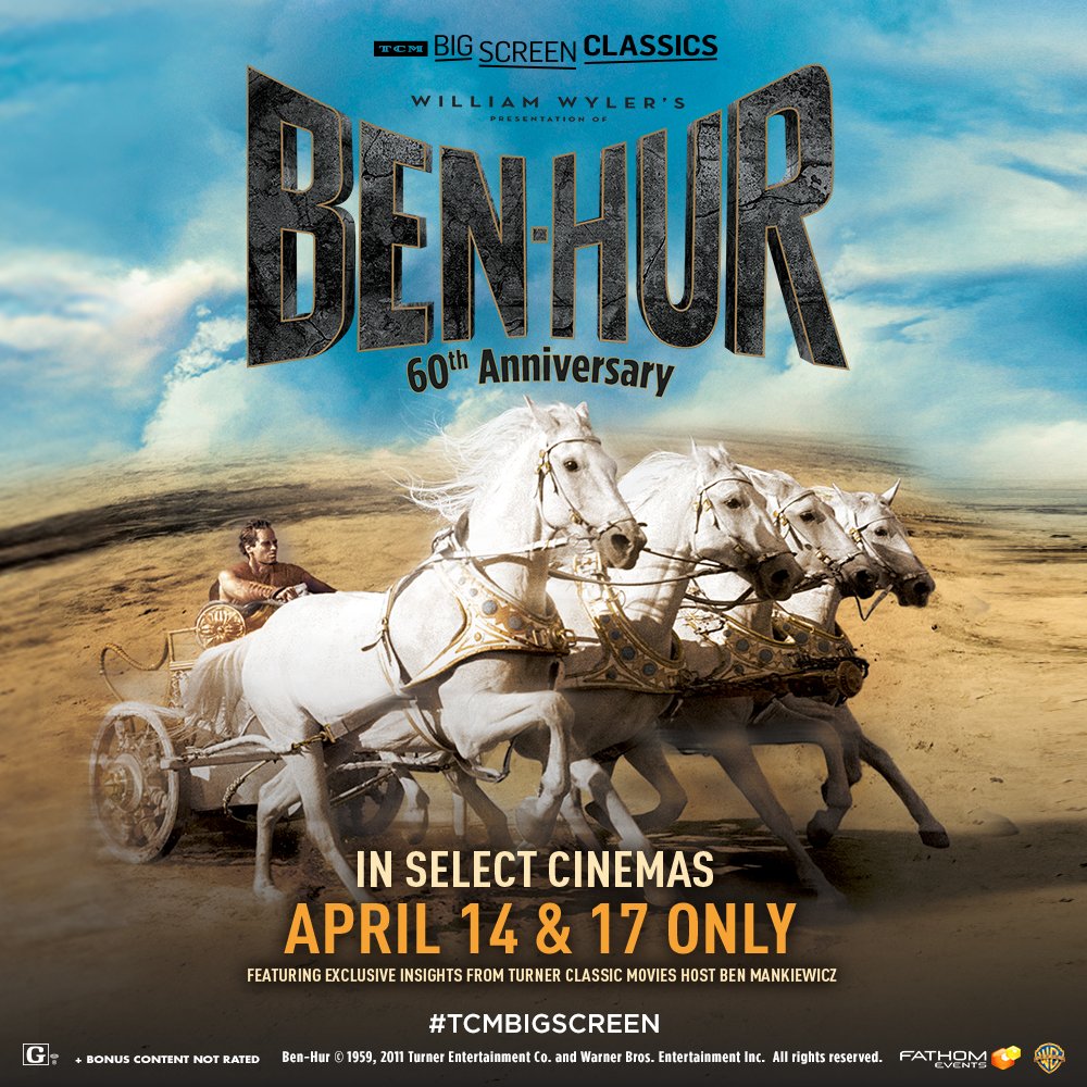 TCM, Warner Bros., and Fathom Events are bringing William Wyler's restored masterpiece Ben-Hur back to the big screen for its 60th anniversary from TCM on April 14 & 17. Reserve your seats here: https://bit.ly/2uaXZ9T pic.twitter.com/h5he3JDpfT