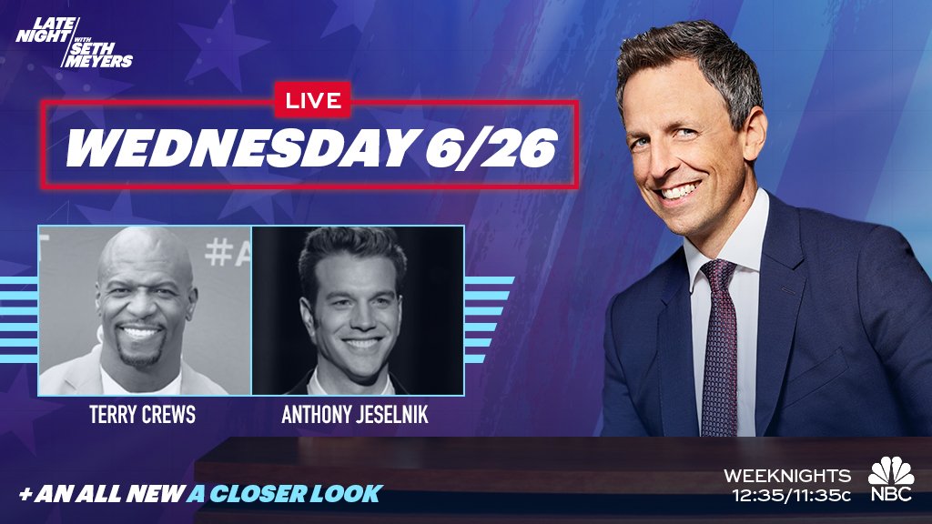Tonight, #LNSM goes LIVE after the first #DemDebate! Seth responds with #ACloserLook, we have a new #JokesSethCantTell, then Seth welcomes @terrycrews and @anthonyjeselnik. #LNSMLive pic.twitter.com/llv8FXhydo